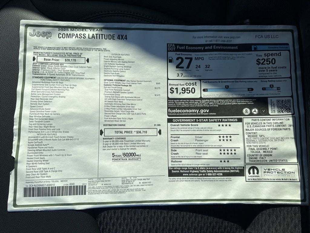 Andy Mohr Chrysler Dodge Jeep Ram is excited to offer this 2025 Jeep Compass Latitude in Silver Zynith Metallic Clearcoat with Black Cloth. This Compass is very well equipped with Sun & Sound Group (Power Front/Fixed Rear Full Sunroof and Premium Alpine Speaker System), Apple CarPlay/Android Auto, Foot Activated Open 'N Go Liftgate, Heated door mirrors, Heated front seats, Heated steering wheel, Leather steering wheel, Power Liftgate, Power windows, Rear window defroster, Remote keyless entry, and Telescoping steering wheel.
