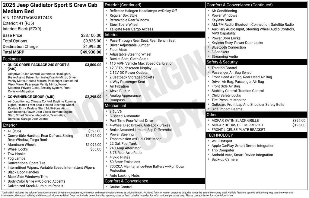 Convenience Group (Corning Gorilla Glass, Daytime Running Lamp System, Emergency/Assistance Call, Front Door Locks 2-Door Passive Entry, Heated Front Seats, Heated Steering Wheel, Remote Start System, and Universal Garage Door Opener), Quick Order Package 24S Sport S (Deep Tint Sunscreen Windows, Power Heated Mirrors, Premium Wrapped Steering Wheel, Advanced Brake Assist, Automatic Headlamps, Enhanced Adaptive Cruise Control, Full Speed Forward Collision Warning Plus, Normal Duty Plus Suspension, Security Alarm, Sun Visors w/Illuminated Vanity Mirrors, and Wheels: 17 x 7.5 Gray), Apple CarPlay/Android Auto, Power windows, Remote keyless entry, Telescoping steering wheel, 110 MPH Vehicle Max Speed Calibration, 12.3 Touchscreen Display, 3.73 Rear Axle Ratio, 4-Wheel Disc Brakes, 4G LTE Wi-Fi Hot Spot, 8 Speakers, ABS brakes, Air Conditioning, Alexa Built-In, AM/FM radio: SiriusXM, Apple CarPlay, Black 3-Piece Hard Top, Brake assist, Cloth Low-Back Bucket Seats, Compass, Connectivity - US/Canada, Delay-off headlights, Driver door bin, Driver vanity mirror, Dual front impact airbags, Dual front side impact airbags, Electronic Stability Control, Freedom Panel Storage Bag, Front anti-roll bar, Front Bucket Seats, Front Center Armrest w/Storage, Front fog lights, Front License Plate Bracket, Front reading lights, Google Android Auto, Illuminated entry, Integrated roll-over protection, Low tire pressure warning, MOPAR Doors Off Mirror Kit, MOPAR Satin Black Grille, Normal Duty Suspension, Occupant sensing airbag, Outside temperature display, Overhead airbag, Panic alarm, ParkView Rear Back-Up Camera, Passenger door bin, Passenger vanity mirror, Power steering, Radio data system, Radio: Uconnect 5 w/12.3 Display, Rear anti-roll bar, Rear reading lights, Rear Sliding Window, Rear Window Defroster, Speed control, Split folding rear seat, Steering wheel mounted audio controls, Tachometer, Tilt steering wheel, Traction control, Trip computer, USB Host Flip, Variably intermittent wipers, Voltmeter, Wheels: 17 x 7.5 Black Steel Styled, and Wheels: 17 x 7.5 Machined w/Black PocketS. Price includes: $2000 - 2025 National Select Inventory Bonus Cash w/ 3FV . Exp. 02/02/2026 $2250 - 2025 National Retail Bonus Cash . Exp. 02/02/2026