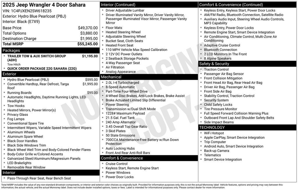 Trailer Tow & Aux Switch Group (7 & 4 Pin Wiring Harness, Auxiliary Switches, and Class II Receiver Hitch), Quick Order Package 22G Sahara, Apple CarPlay, Apple CarPlay/Android Auto, Heated door mirrors, Heated steering wheel, Integrated roll-over protection, ParkView Rear Back-Up Camera, Power windows, Rear Window Defroster, Remote keyless entry, Telescoping steering wheel, 110 MPH Vehicle Max Speed Calibration, 3.45 Overall Top Gear Ratio, 4-Wheel Disc Brakes, 4G LTE Wi-Fi Hot Spot, 8 Speakers, ABS brakes, Air Conditioning, Alloy wheels, AM/FM radio: SiriusXM, Automatic temperature control, Aux Battery, Body Color 3-Piece Hard Top, Brake assist, Cloth Low-Back Bucket Seats, Compass, Connectivity - US/Canada, Delay-off headlights, Driver door bin, Driver vanity mirror, Dual front impact airbags, Dual front side impact airbags, Electronic Stability Control, Emergency communication system: Jeep Connect, Freedom Panel Storage Bag, Front anti-roll bar, Front Bucket Seats, Front Center Armrest w/Storage, Front dual zone A/C, Front fog lights, Front reading lights, Fully automatic headlights, Google Android Auto, Heated front seats, Heavy Duty Suspension w/Gas Shocks, Illuminated entry, Integrated Center Stack Radio, Low tire pressure warning, Non-Lock Fuel Cap w/o Discriminator, Occupant sensing airbag, Outside temperature display, Overhead airbag, Panic alarm, Passenger door bin, Passenger vanity mirror, Power door mirrors, Power steering, Radio data system, Radio: Uconnect 5 w/12.3 Display, Rear anti-roll bar, Rear reading lights, Rear Window Wiper/Washer, Security system, Side Steps, Speed control, Split folding rear seat, Steering wheel mounted audio controls, Stop-Start Dual Battery System, Tachometer, Tilt steering wheel, Traction control, Trip computer, Variably intermittent wipers, Voltmeter, and Wheels: 18 x 7.5 Machine/Painted GraY. Price includes: $1500 - 2025 National Bonus Cash . Exp. 02/02/2026 $2500 - 2025 National Retail Bonus Cash . Exp. 02/02/2026