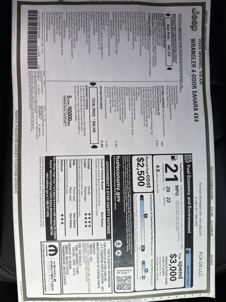 Sahara Popular Equipment Group (#1 Seat Foam Cushion, 12.3 Touchscreen Display, 4G LTE Wi-Fi Hot Spot, Alpine Premium Audio System, Apple CarPlay, Auto High Beam Headlamp Control, Auto-Dimming Rear-View Mirror, Blind Spot & Cross Path Detection, Connected Travel & Traffic Services, Connectivity - US/Canada, Disassociated Touchscreen Display, For More Info, Call 800-643-2112, Google Android Auto, GPS Navigation, Hard Seat Back, HD Radio, Integrated Center Stack Radio, Integrated Off-Road Camera, Integrated Voice Command w/Bluetooth®, Leather Wrapped Park Brake Handle, Leather Wrapped Shift Knob, McKinley Trimmed Seats, ParkSense Rear Park Assist System, Power 4-Way Driver Lumbar Adjust, Power 4-Way Passenger Lumbar Adjust, Power Adjust 8-Way Driver Seat, Power Adjust 8-Way Front Passenger Seat, Radio: Uconnect 5 Nav w/12.3 Display, Side Steps, SiriusXM Radio Service, SiriusXM w/360L, and Universal Garage Door Opener), Quick Order Package 22G Sahara, Apple CarPlay/Android Auto, Heated door mirrors, Heated front seats, Heated steering wheel, Integrated roll-over protection, ParkView Rear Back-Up Camera, Rear Window Defroster, Telescoping steering wheel, Wheels: 18 x 7.5 Machine/Painted Gray, 110 MPH Vehicle Max Speed Calibration, 3.45 Overall Top Gear Ratio, 4-Wheel Disc Brakes, 8 Speakers, ABS brakes, Air Conditioning, Alloy wheels, AM/FM radio: SiriusXM, Automatic temperature control, Aux Battery, Body Color 3-Piece Hard Top, Brake assist, Cloth Low-Back Bucket Seats, Compass, Delay-off headlights, Driver door bin, Driver vanity mirror, Dual front impact airbags, Dual front side impact airbags, Electronic Stability Control, Emergency communication system: Jeep Connect, Freedom Panel Storage Bag, Front anti-roll bar, Front Bucket Seats, Front Center Armrest w/Storage, Front dual zone A/C, Front fog lights, Front reading lights, Fully automatic headlights, Heavy Duty Suspension w/ Price includes: $1500 - 2025 National Bonus Cash . Exp. 02/02/2026 $2000 - 2025 National Select Inventory Bonus Cash w/ 3FV . Exp. 02/02/2026 $2500 - 2025 National Retail Bonus Cash . Exp. 0