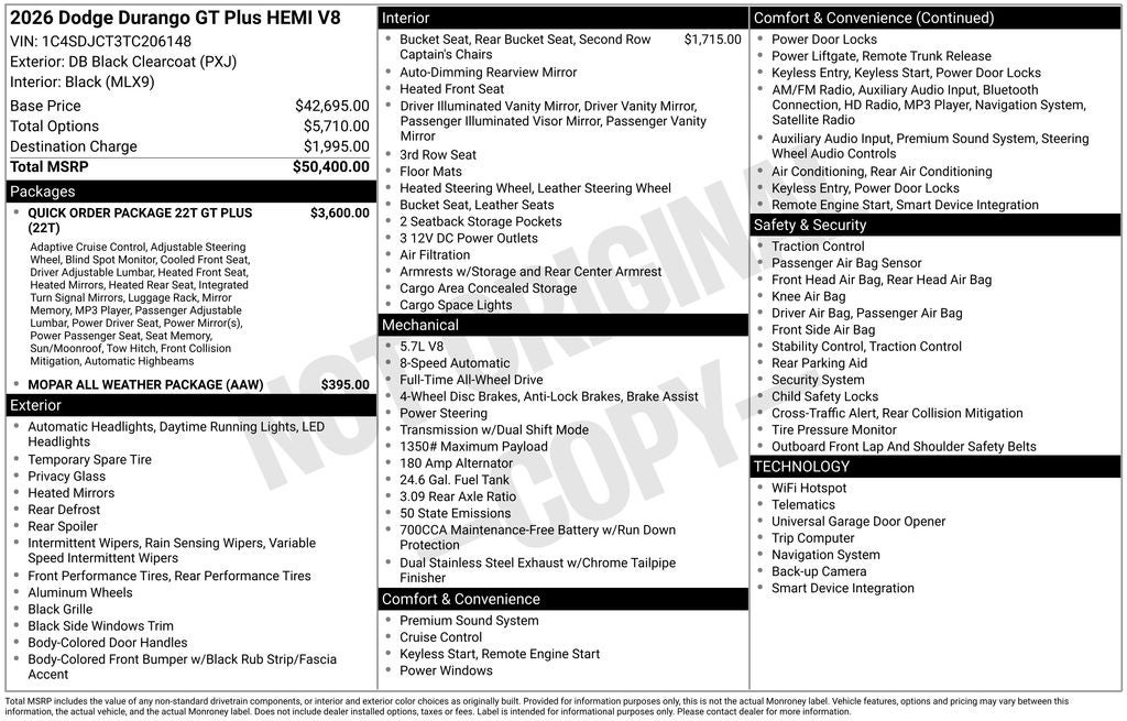 MOPAR All Weather Package (Cargo Net, MOPAR Front and Rear Door Entry Guards, and MOPAR Slush Mats), Quick Order Package 22T GT Plus (Adaptive Cruise Control with Stop, Heated Second Row Seats, Power Sunroof, Red Accent Stitching, Ventilated Front Seats, 115V Auxiliary Power Outlet, 7 and 4 Pin Wiring Harness, Auto High Beam Headlamp Control, Auto-Dimming Exterior Driver Mirror, Black Roof Rails, Blind Spot with Trailer Detection, Class IV Receiver Hitch, Dual Remote USB Port - Charge Only, Exterior Mirrors with Heating Element, Exterior Mirrors with Memory, Exterior Mirrors with Supplemental Signals, Floor Console with Leather Armrest, Full Speed Forward Collision Warning Plus, Gloss Black Exterior Mirrors, Integrated Roof Rail Crossbars, Leather Trimmed Bucket Seats, Leather Wrapped Door Panels, LED Auxiliary Low Beam and Turn Signal, Power 6x9 Multi-Function Foldaway Mirrors, Power 8-Way Driver Memory 8-Way Passenger Seats, Power Driver/Passenger 4-Way Lumbar Adjust, Power Tilt and Telescopic Steering Column, Radio/Driver Seat/Mirrors Memory, and Trailer Brake Control), 2nd Row Fold/Tumble Captain Chairs, 2nd Row Mini Console with Cupholders, 2nd Row Seat Mounted Inboard Armrests, 3rd Row Floor Mat and Mini Console, 6-Passenger Seating, 9 Speakers, Apple CarPlay/Android Auto, Garage door transmitter, Heated front seats, Heated steering wheel, Navigation System, ParkView Rear Back-Up Camera, Wheels: 20 x 8 Satin Carbon Split 5-Spoke, 3.09 Rear Axle Ratio, 3rd row seats: split-bench, 4-Wheel Disc Brakes, ABS brakes, Air Conditioning, Alloy wheels, AM/FM radio: SiriusXM w/360L, Auto-dimming Rear-View mirror, Auto-leveling suspension, Automatic temperature control, Brake assist, Bumpers: body-color, Cloth Bucket Seats with Shift Insert, Compass, Delay-off headlights, Driver door bin, Driver vanity mirror, Dual front impact airbags, Dual front side impact airbags, Electronic Stability Control, Emergency communication system: Dodge Connect, Four wheel independent suspension, Front anti-roll bar, Front Bucket Seats, Front Center Armrest w/Storage, Front dual zone A/C, Front reading lights, Fully automatic headlights, Heated door mirrors, Illuminated entry, Knee airbag, Leather steering wheel, Low tire pressure warning, Occupant sensing airbag, Outside temperature display, Overhead airbag, Overhead console, Panic alarm, Passenger door bin, Passenger vanity mirror, Power door mirrors, Power driver seat, Power Liftgate, Power steering, Power windows, Radio data system, Radio: Uconnect 5 Nav with 10.1 Display, Rain sensing wipers, Rear air conditioning, Rear anti-roll bar, Rear Load Leveling Suspension, Rear reading