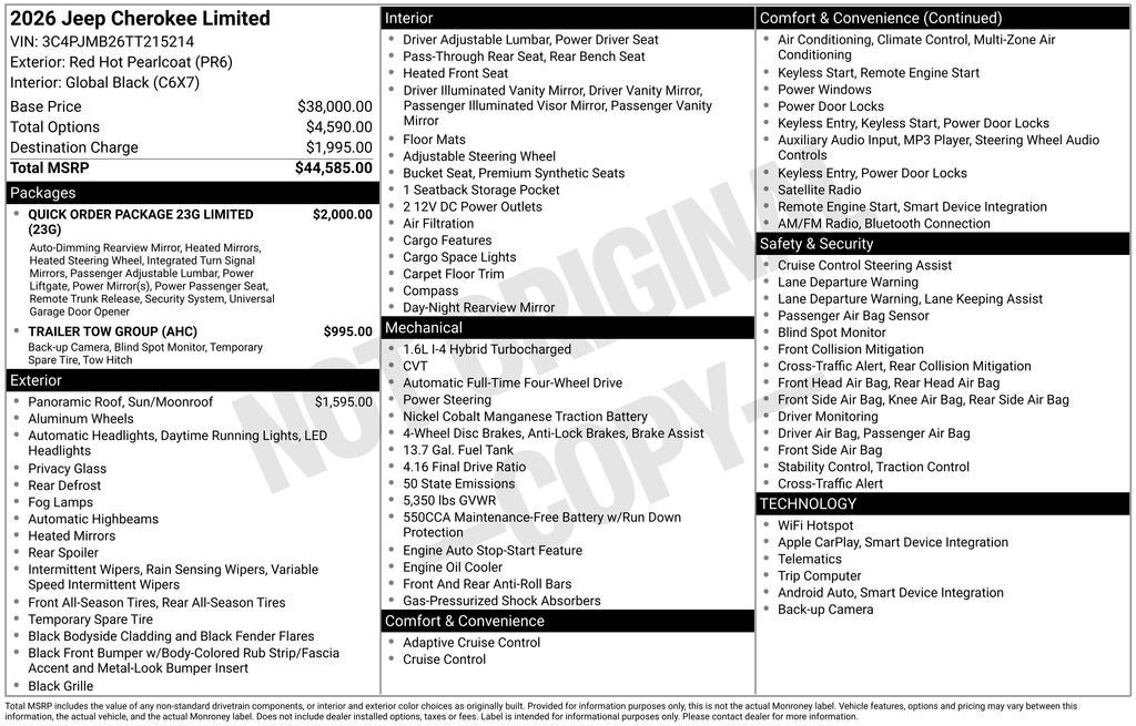 Andy Mohr Chrysler Dodge Jeep Ram is excited to offer this 2026 Jeep Cherokee in Red Hot Pearlcoat with Global Black Artificial Leather. This Cherokee is very well equipped with Apple CarPlay/Android Auto, Heated door mirrors, Outside temperature display, ParkView Rear Back-Up Camera, Remote keyless entry, and Telescoping steering wheel.
