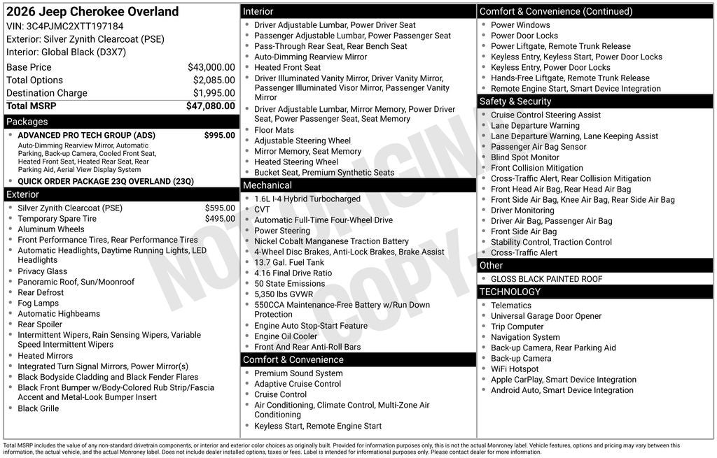 Andy Mohr Chrysler Dodge Jeep Ram is very proud to offer this 2026 Jeep Cherokee Overland in Silver Zynith Clearcoat with Global Black Artificial Leather. This Cherokee is very well equipped with Apple CarPlay/Android Auto, ParkView Rear Back-Up Camera, and Remote keyless entry.