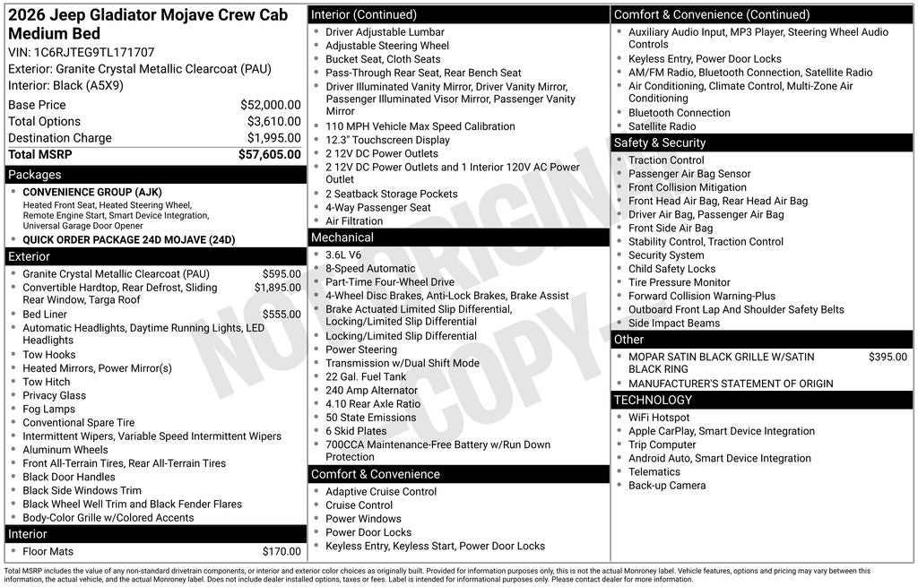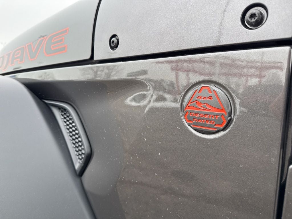 Convenience Group (Heated Front Seats, Heated Steering Wheel, Remote Start System, and Universal Garage Door Opener), Quick Order Package 24D Mojave, 8 Speakers, Apple CarPlay/Android Auto, Body Color 3-Piece Hard Top, Dual front impact airbags, Freedom Panel Storage Bag, Power windows, Premium Cloth Seats with Sport Bolsters, Rear Sliding Window, Rear Window Defroster, Remote keyless entry, Wheels: 17 x 7.5 Dark Gray Painted, 110 Mph Vehicle Max Speed Calibration, 12.3 Touchscreen Display, 4-Wheel Disc Brakes, 4.10 Rear Axle Ratio, 4G LTE Wi-Fi Hot Spot, ABS brakes, Air Conditioning, Alexa Built-in, Alloy wheels, AM/FM radio: SiriusXM with 360L, Apple CarPlay, Automatic temperature control, Brake assist, Compass, Connectivity - US/Canada, Delay-off headlights, Driver door bin, Driver vanity mirror, Dual front side impact airbags, Electronic Stability Control, Emergency communication system: Jeep Connect, For Details, Visit DriveUconnect.com, Front anti-roll bar, Front Bucket Seats, Front Center Armrest w/Storage, Front dual zone A/C, Front fog lights, Front reading lights, Fully automatic headlights, Google Android Auto, Heated door mirrors, Heavy Duty Suspension with Gas Shocks, Illuminated entry, Integrated Center Stack Radio, Integrated roll-over protection, Low tire pressure warning, Manufacturer's Statement of Origin, MOPAR All-Weather Slush Mats, MOPAR Satin Black Grille with Satin Black Ring, MOPAR Spray in Bedliner, Occupant sensing airbag, Outside temperature display, Overhead airbag, Panic alarm, Passenger door bin, Passenger vanity mirror, Power door mirrors, Power steering, Radio data system, Radio: Uconnect 5 with 12.3 Display, Rear anti-roll bar, Rear reading lights, Security system, SiriusXM Radio Service, SiriusXM with 360L, Speed control, Split folding rear seat, Steering wheel mounted audio controls, Tachometer, Telescoping steering wheel, Tilt steering wheel, Traction control, Trip computer, USB Host Flip, Variably intermittent wipers, and VoltmeteR.