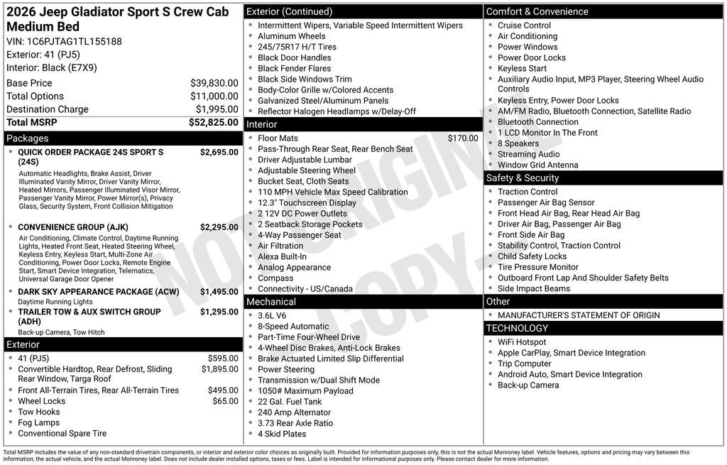 Andy Mohr Chrysler Dodge Jeep Ram is pumped up to offer this 2026 Jeep Gladiator Sport S in Pj5 with Black Cloth. This Gladiator is very well equipped with Trailer Tow and Auxiliary Switch Group (Auxiliary Switches, Class IV Receiver Hitch, Heavy-Duty Engine Cooling, and Trailer Hitch Zoom), Apple CarPlay/Android Auto, Heated Front Seats, Heated Steering Wheel, MOPAR All-Weather Slush Mats, ParkView Rear Back-Up Camera, Power Heated Mirrors, Power windows, Premium Wrapped Steering Wheel, Rear Window Defroster, Remote keyless entry, Remote Start System, Telescoping steering wheel, and Universal Garage Door Opener.