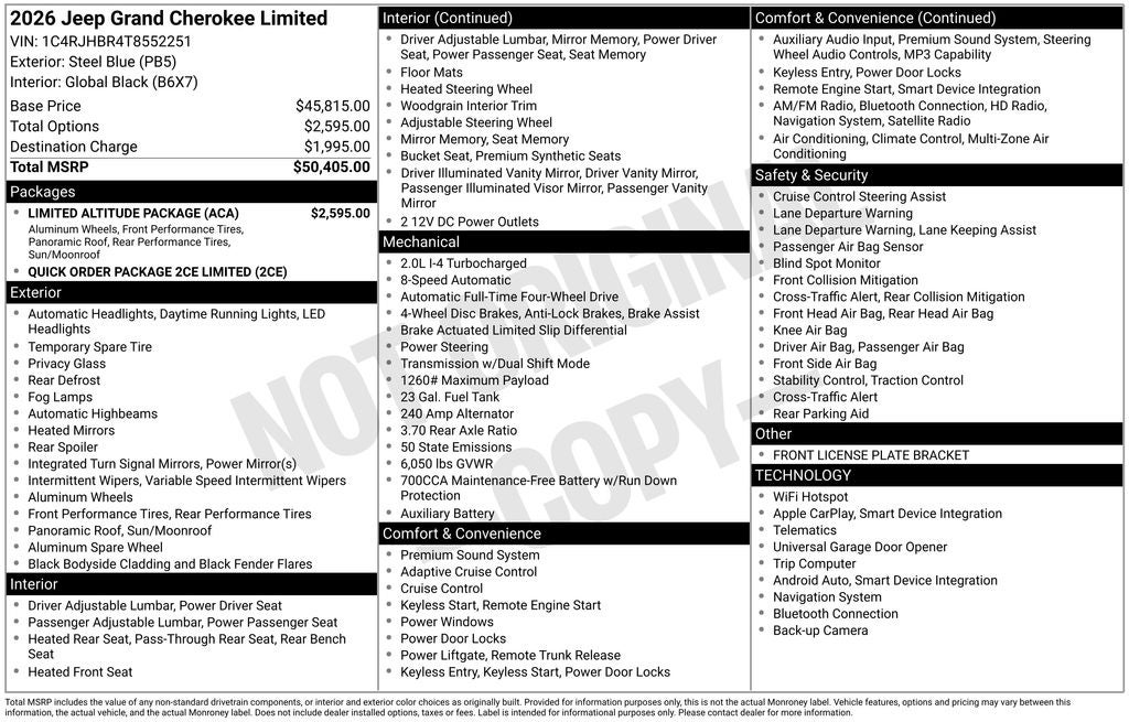 Whether you're embarking on an off-road adventure or navigating the urban jungle, the 2026 Jeep Grand Cherokee Limited is the ultimate expression of refined power and sophistication. Experience the difference for yourself and schedule a test drive today. We're confident this exceptional SUV will exceed your expectations and leave a lasting impression.
