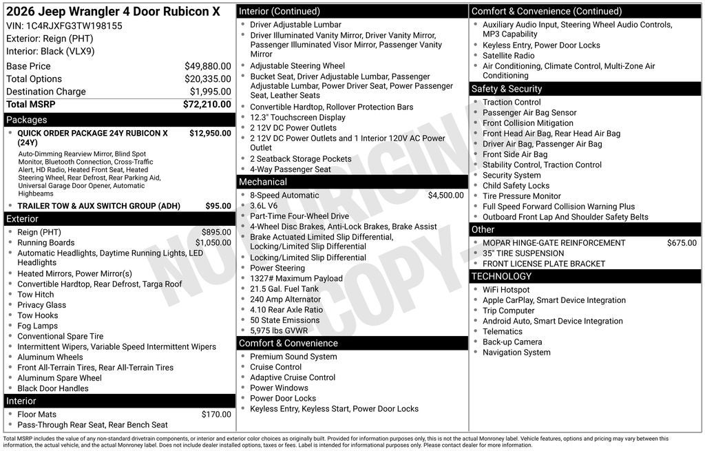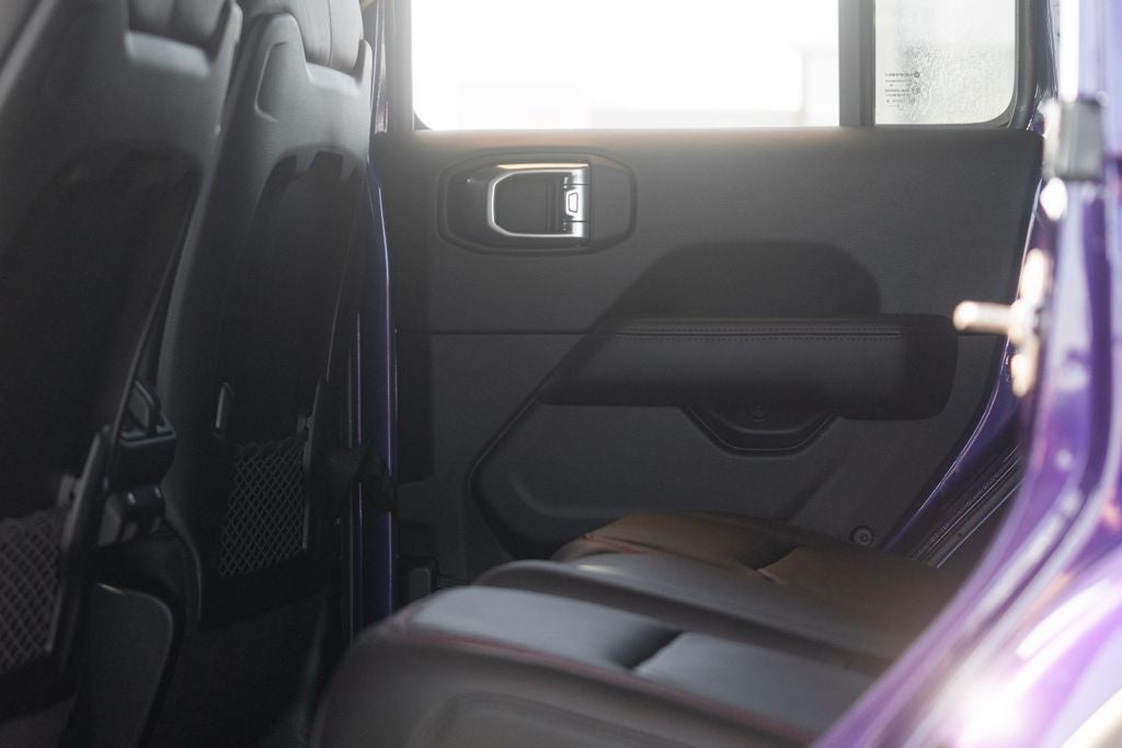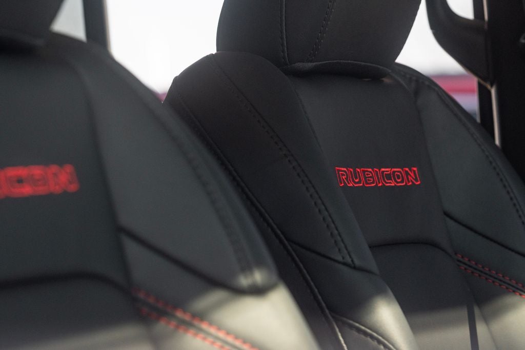 Trailer Tow Prep Package, Quick Order Package 24Y Rubicon X (Acoustic Laminated Front Door Glass, Heated Front Seats, Heated Steering Wheel, Rear Window Defroster, 12.3 Touchscreen Display, 4G LTE Wi-Fi Hot Spot, Acoustic Front Seat Area Carpet, Alpine Premium Audio System, Apple CarPlay, Auto High Beam Headlamp Control, Auto-Dimming Rear-View Mirror, Body Color 3-Piece Hard Top, Body Color Rubicon Highline Flare, Connectivity - US/Canada, Freedom Panel Storage Bag, Google Android Auto, HD Radio, Integrated Off-Road Camera, Leather Wrapped Park Brake Handle, Leather Wrapped Shift Knob, MOPAR Hardtop Headliner, Nappa Leather Seats, ParkSense Rear Park Assist System, Power 4-Way Driver Lumbar Adjust, Power 4-Way Passenger Lumbar Adjust, Power Adjust 8-Way Driver Seat, Power Adjust 8-Way Front Passenger Seat, Premium Door Trim Panel, Rear Window Wiper/Washer, Steel Front Bumper, Steel Rear Bumper, and Universal Garage Door Opener), Apple CarPlay/Android Auto, Heated door mirrors, Power door mirrors, Power windows, Remote keyless entry, Telescoping steering wheel, Traction control, 35 Tire Suspension, 4-Wheel Disc Brakes, 8 Speakers, ABS brakes, Air Conditioning, Alloy wheels, AM/FM radio: SiriusXM with 360L, Anti-Lock 4-Wheel Disc Perf Brakes, Automatic temperature control, Aux Battery, Brake assist, Cloth Low-Back Bucket Seats, Compass, Delay-off headlights, Driver door bin, Driver vanity mirror, Dual front impact airbags, Dual front side impact airbags, Electronic Stability Control, Emergency communication system: Jeep Connect, For More Info, Call 800-643-2112, Front anti-roll bar, Front Bucket Seats, Front Center Armrest w/Storage, Front dual zone A/C, Front fog lights, Front License Plate Bracket, Front reading lights, Fully automatic headlights, Illuminated entry, Integrated Center Stack Radio, Integrated roll-over protection, Low tire pressure warning, MOPAR All-Weather Floor Mats, MOPAR Hinge-Gate Reinforcement, Occupant sensing airbag, Outside temperature display, Overhead airbag, Panic alarm, ParkView Rear Back-Up Camera, Passenger door bin, Passenger vanity mirror, Performance Suspension, Power steering, Radio data system, Rear anti-roll bar, Rear reading lights, Security system, SiriusXM Radio Service, Speed control, Split folding rear seat, Steering wheel mounted audio controls, Stop-Start Dual Battery System, Tachometer, Tilt steering wheel, Trip computer, Variably intermittent wipers, Voltmeter, Wheel Flare Extensions, and Wheels: 17 x 7.5 Machined/Painted BlacK.