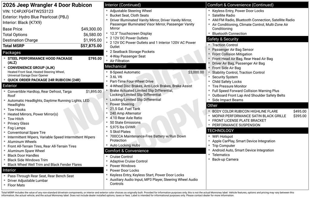 Elevate your driving experience with the Convenience Group, Quick Order Package 24R Rubicon, and Steel Performance Hood Package, which provide a wealth of premium amenities and capabilities. Indulge in the convenience of Apple CarPlay, the comfort of heated steering wheel and front seats, and the confidence of the ParkView Rear Back-Up Camera.