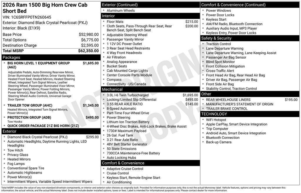 Big Horn Level 1 Equipment Group (115V Auxiliary Power Outlet, 2nd Row in Floor Storage Bins, 3 Rear Seat Head Restraints, 4 Way Front Headrests, 400W Inverter, Auto Power-Folding Mirrors, Auto-Dimming Exterior Driver Mirror, Auto-Dimming Rear-View Mirror, Black Exterior Mirrors, Black Premium Power Mirrors, Body Color Fender Flares, Bucket Seats, Center Console Parts Module, Convex Wide-Angle Exterior Mirror Insert, Deluxe Cloth Bucket Seats, Exterior Mirrors Courtesy Lamps, Exterior Mirrors with Heating Element, Exterior Mirrors with Supplemental Signals, Front Seat Back Map Pockets, Full Length Floor Console, Glove Box Lamp, Heated Front Seats, Heated Steering Wheel, Leather Wrapped Steering Wheel, Manual Adjust 4-Way Front Passenger Seat, Power 2-Way Driver Lumbar Adjust, Power Adjust 8-Way Driver Seat, Power Adjustable Pedals, Rear 60/40 Folding Seat, Rear Center Armrest, Rear Dome with on/Off Switch Lamp, Rear Power Sliding Window, Rear Window Defroster, SiriusXM Radio Service, SiriusXM Satellite Radio, Steering Wheel Mounted Audio Controls, Sun Visors with Illuminated Vanity Mirrors, and Universal Garage Door Opener), Trailer Tow Group (Accent Color Tailgate Handle, Black Trailer Tow Power Mirrors, Manual Folding Exterior Mirrors, Manual Telescoping Mirrors, Mirror Clearance/Running Lights, Power-Adjustable Convex Aux Mirrors, Trailer Brake Control, Tra Price includes: $2000 - 2026 National Select Inventory Bonus Cash. Exp. 03/02/2026 $3500 - 2026 National Retail Consumer Cash . Exp. 03/02/2026 $500 - 2026 Great Lakes BC Truck Month Bonus Cash . Exp. 0