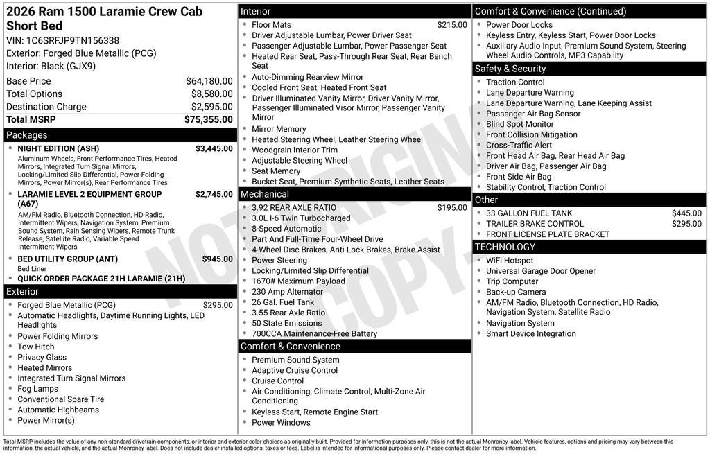Night Edition (Accent Color Door Handles, Accent Color Premium Power Mirrors, Accent Color Tailgate Handle, Anti-Spin Differential Rear Axle, Auto Power-Folding Mirrors, Auto-Dimming Exterior Driver Mirror, Black Exterior Truck Badging, Black Headlamp Bezels, Black Interior Accents, Black Painted Exterior Mirrors Caps, Black Tail Lamp Bezels, Body Color Front Bumper, Body Color Rear Bumper with Step Pads, Convex Wide-Angle Exterior Mirror Insert, Dual Exhaust with Black Tips, Exterior Mirrors Approach Lamps, Exterior Mirrors Courtesy Lamps, Exterior Mirrors with Heating Element, Exterior Mirrors with Memory, Exterior Mirrors with Supplemental Signals, Grille Surround 3 Black Texture 2 Black, Pirelli Brand Tires, Proximity Approach/Departure Lamps, RAM Grille Badge - Black, Sport Performance Hood, and Wheels: 22 x 9 Forged Aluminum), Bed Utility Group, Laramie Level 2 Equipment Group (GPS Navigation, 4G LTE Wi-Fi Hot Spot, Connectivity - US/Canada, Integrated Center Stack Radio, SiriusXM Radio Service, and USB Host Flip), Quick Order Package 21H Laramie, Heated front seats, Heated rear seats, Heated steering wheel, Memory seat, Navigation System, Remote keyless entry, 10 Speakers, 33 Gallon Fuel Tank, 4-Wheel Disc Brakes, ABS brakes, Air Conditioning, Alloy wheels, AM/FM radio: SiriusXM with 360L, Apple CarPlay/Android Auto, Audio memory, Auto High-beam Headlights, Auto-dimming door mirrors, Auto-dimming Rear-View mirror, Automatic temperature control, Brake assist, Bumpers: chrome, Chrome Exterior Mirrors, Compass, Delay-off headlights, Driver door bin, Driver vanity mirror, Dual front impact airbags, Dual front side impact airbags, Electronic Stability Control, Front anti-roll bar, Front Bucket Seats, Front Center Armrest w/Storage, Front dual zone A/C, Front fog lights, Front License Plate Bracket, Front reading lights, Front wheel independent suspension, Fully automatic headlights, Garage door transmitter, Heated door mirrors, Illuminated entry, Leather steering wheel, Leather Trimmed Bucket Seats, Low tire pressure warning, Occupant sensing airbag, Off-Road Information Pages, Outside temperature display, Overhead airbag, Ove Price includes: $3500 - 2026 National Retail Consumer Cash . Exp. 02/02/2026 $500 - 2026 Great Lakes BC SFS Bonus Cash . Exp. 0